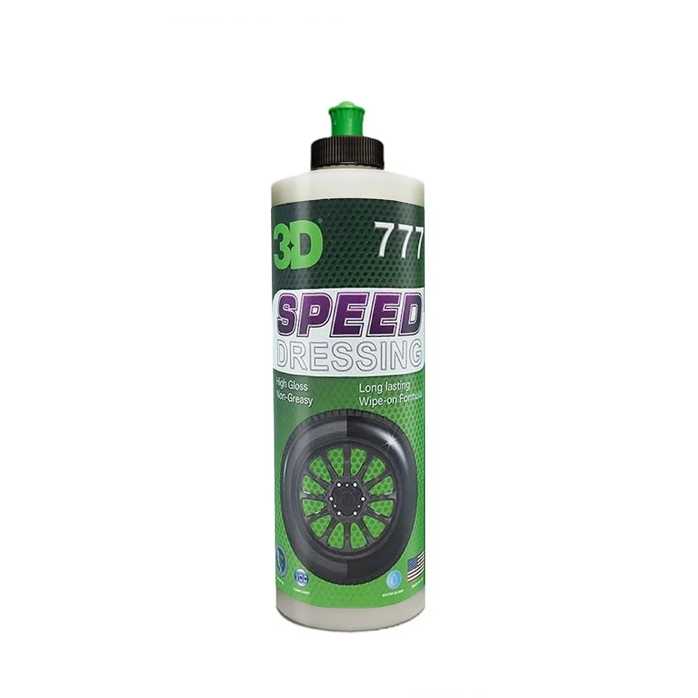 ABRILLANTADOR DE NEUMÁTICOS A BASE DE AGUA. BIODEGRADABLE. 777 Speed Dressing: es un revividor/abrillantador de neumáticos y plásticos no graso, seguro para todos los neumáticos, plásticos y molduras exteriores. Su innovadora fórmula a base de gel es muy fácil de aplicar y no deja residuos. Debido a su alto contenido de silicona, permitirá un brillo duradero y prolongado.