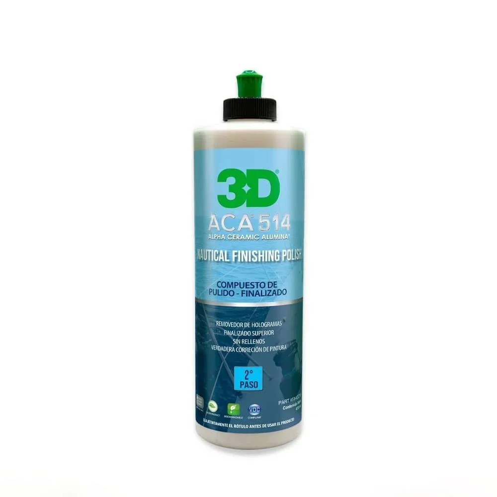 3D ACA NAUTICAL FINISHING POLISH CREMA DE PULIDO 3D - ALPHA CERAMIC ALUMINA Tecnología ALPHA CERAMIC ALUMINA - COMPUESTO DE PULIDO - FINALIZADO - 2•PASO ACA 514 es un compuesto de pulido y finalizado, segundo paso. Diseñado con tecnología Alpha Ceramic Alumina para trabajo en embarcaciones. ACA 514 es un removedor de hologramas de fácil aplicación, con un finalizado superior y real corrección de pintura, sin rellenos. No genera polvo. Biodegradable.