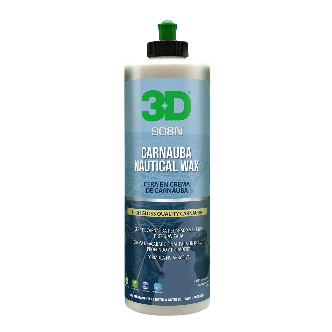 3D Carnauba Nautical Wax CERA EN CREMA DE CARNAUBA CERA DE CARNAUBA DEL GRADO MÁS FINO. PRE-SUAVIZADA. OTORGA BRILLO PROFUNDO Y DURADERO. FÓRMULA NO ABRASIVA. Su presentación en crema contiene el grado más fino de cera de Carnauba Brasilera, reconocida como una de las mejores ceras del mundo. Los enlaces producidos por las partículas de cera de Carnauba de grado fino, dejan una superficie super-hidrófuga, permitiendo el deslizamiento del agua bajo cualquier condición climática, protegiendo su pintura de los efectos de la lluvia ácida, manchas por salitre, acumulación de suciedad, etc. Brinda un acabado increíblemente brillante en colores oscuros y metalizados.