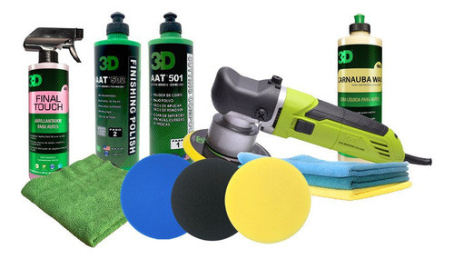 Contenido del kit: Máquinas y Pads de Alto Rendimiento L-35 - 3D Dual Action PolisherPulidora orbital de doble acción diseñada para brindar un acabado profesional sin generar marcas. Compuestos y Acabados 501OZ16 - AAT Rubbing CompoundCompuesto para corte rápido que elimina rayas profundas y otras imperfecciones sin generar polvo. 502OZ16 - AAT Finishing PolishPulidor de acabado que brinda un brillo perfecto, ideal para el toque final después del corte. 908OZ16 - Carnauba Wax 16OZCera de carnauba en presentación de 16 oz, proporciona una protección duradera y un brillo superior. 403OZ16 - Final TouchDetallador de alta calidad para un acabado rápido y sin residuos, ideal para dar el toque final. Toallas de Microfibra de Alto Grado G-38Y x3- 3D Microfiber Cleaning Towel - YellowToalla de microfibra amarilla para la limpieza general y la remoción de compuestos. G-35G - Plush Microfiber TowelToalla de microfibra extra suave para acabados finos y aplicaciones delicadas. (Imágenes Ilustrativas)
