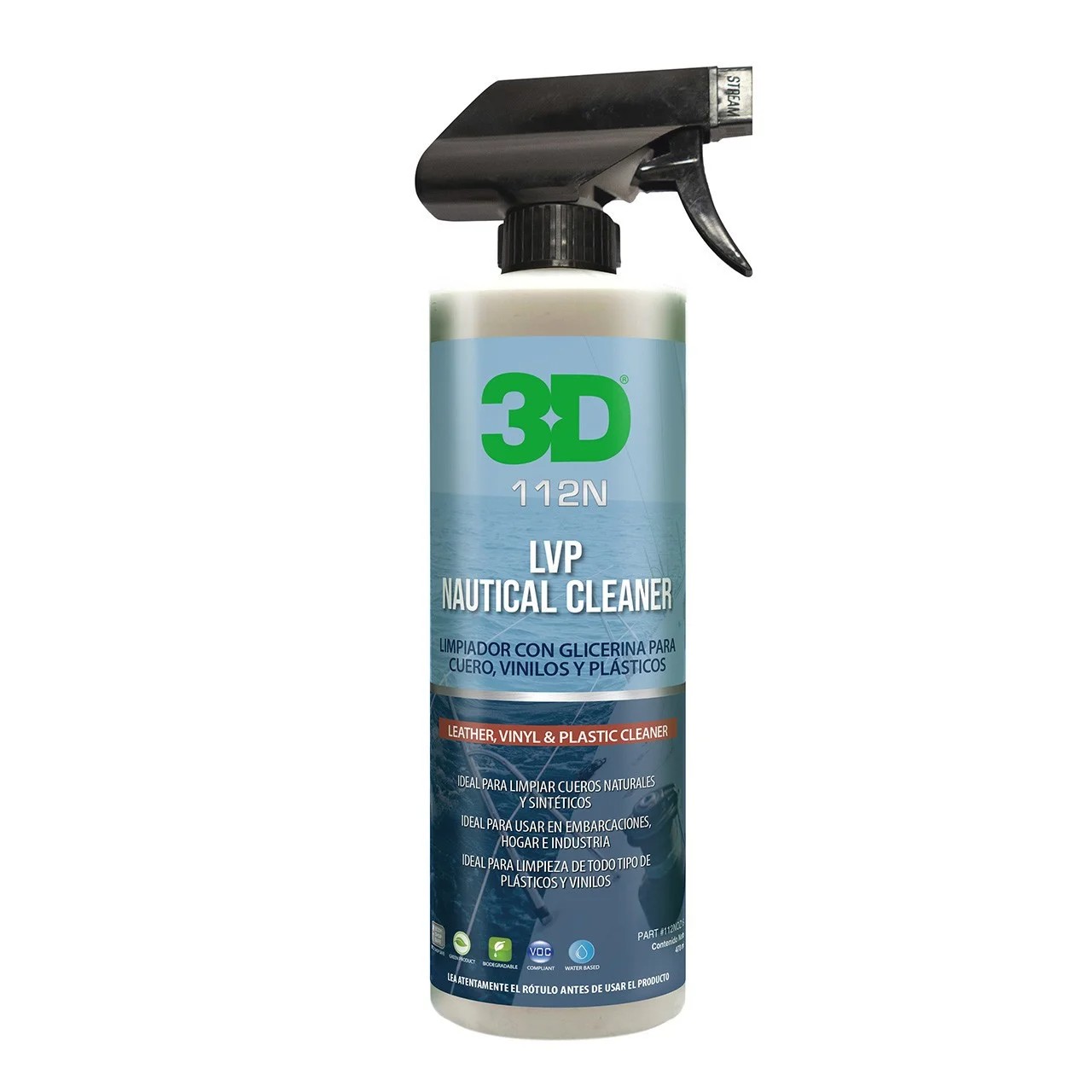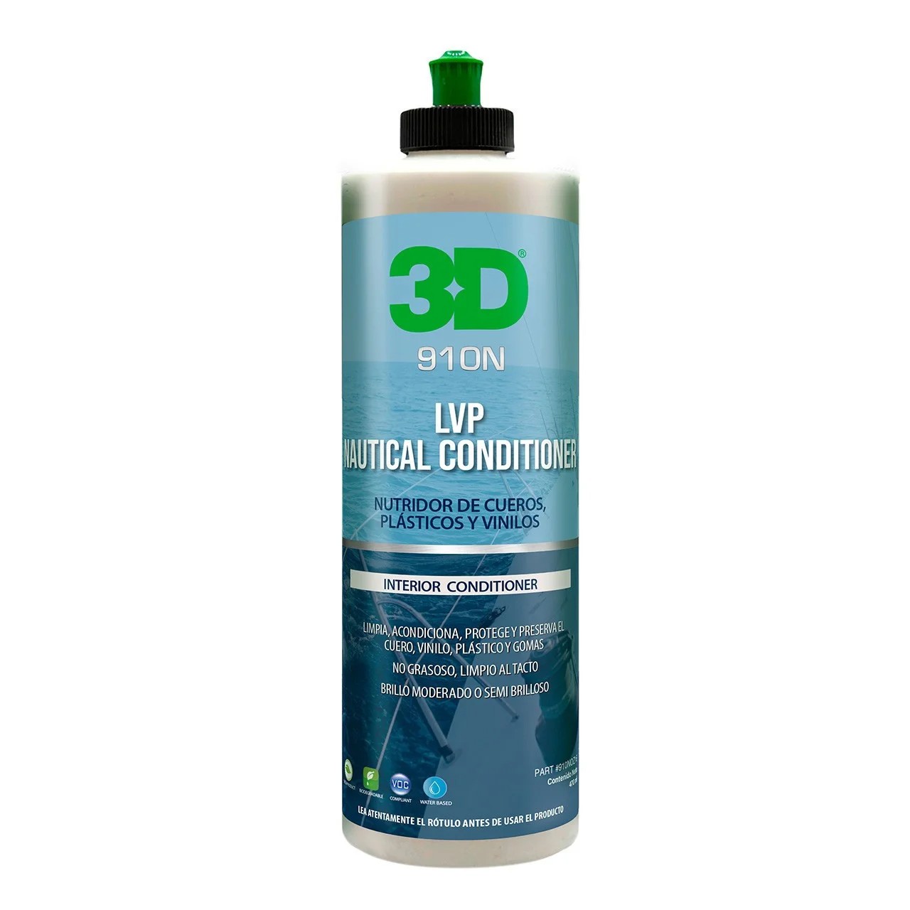 3D LVP Nautical Conditioner NUTRIDOR DE CUEROS, PLÁSTICOS Y VINILOS LIMPIA, ACONDICIONA, PROTEGE Y PRESERVA EL CUERO, VINILO, PLÁSTICO Y GOMAS. NO GRASOSO, LIMPIO AL TACTO. BRILLO MODERADO O SEMI BRILLOSO 3D LVP Nautical Conditioner, acondiciona y protege el cuero, el vinilo y el plástico en un solo paso. Este producto está hecho con aceite de Vison para crear suavidad adicional y extender la vida útil del cuero, el vinilo y el plástico, protegiéndo a la vez de los rayos UV. Este producto se absorbe para dejar una superficie suave, sin grasitud, ni brillo extra para restaurar la humedad en el interior de cualquier vehículo.