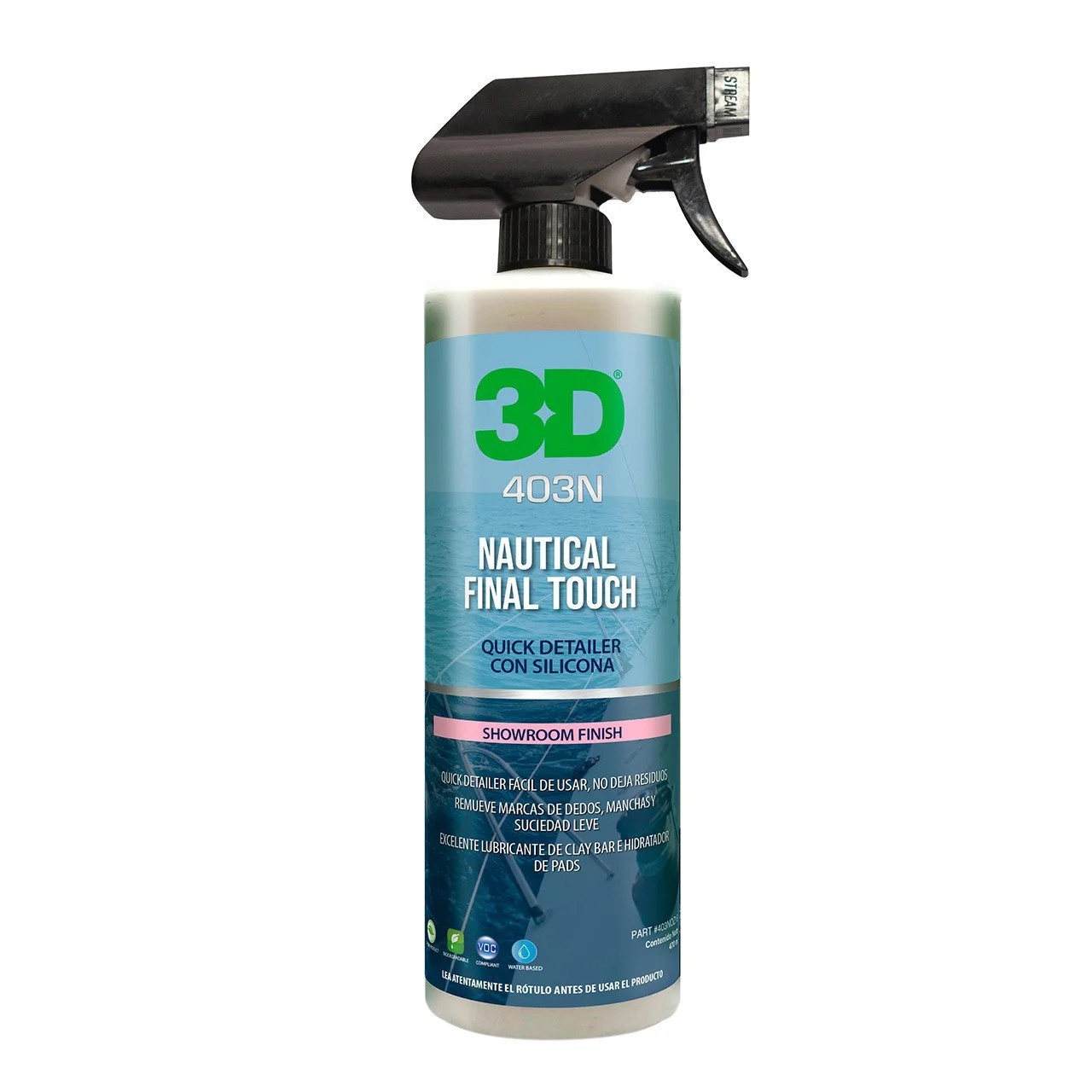 3D Nautical Final Touch QUICK DETAILER CON SILICONA QUICK DETAILER FÁCIL DE USAR, NO DEJA RESIDUOS. REMUEVE MARCAS DE DEDOS, MANCHAS Y SUCIEDAD LEVE. EXCELENTE LUBRICANTE DE CLAY BAR E HIDRATADOR DE PADS 3D Nautical Final Touch es un versátil Quick Detailer desarrollado para dejar una terminación «de salón» en todo tipo de vehículos. Su fórmula está especialmente diseñada para remover marcas de dedos y residuos de cera, proporcionando brillo y suavidad a las superficies. Contiene polímeros lubricantes que realzan el brillo mientras protegen las capas de cera ya existentes. Es ideal para todo tipo de superficies pintadas, cromo y cristales. Puede utilizarse también como lubricante de CLAY BAR