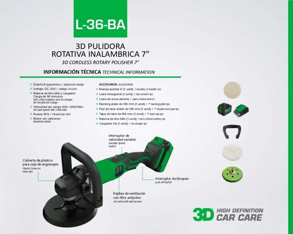 Descubre la libertad de un detallado sin límites con la Pulidora Rotativa Inalámbrica L-36BA de 3D High Definition Car Care. Diseñada para profesionales y entusiastas que buscan resultados impecables, esta pulidora de 7 pulgadas combina la potencia de un motor sin carbones con la comodidad de un diseño ergonómico y sin cables. Olvídate de las extensiones y trabaja con total movilidad y control.