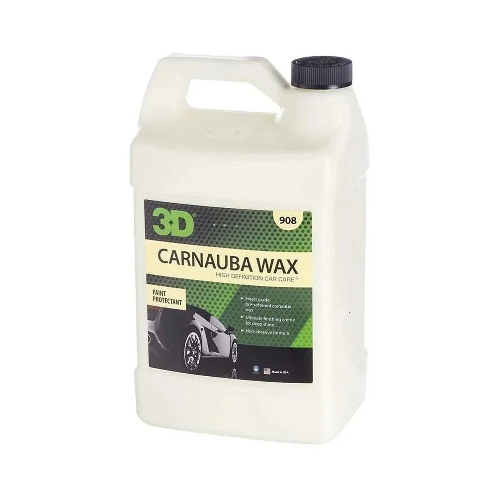 3D CARNAUBA WAX contiene la última tecnología en cera liquida. Su presentación en crema contiene el grado más fino de cera de Carnauba Brasilera, reconocida como una de las mejores ceras del mundo (superadas solo por las ceras Montan). Los enlaces producidos por las partículas de cera de Carnauba de grado fino, dejan una superficie super-hidrófuga, permitiendo el deslizamiento del agua bajo cualquier condición climática, protegiendo su pintura de los efectos de la lluvia acida, manchas por salitre, acumulación de suciedad, etc. Puede utilizarse sobre cualquier tipo de pinturas, brinda un acabado increíblemente brillante en colores oscuros y metalizados.