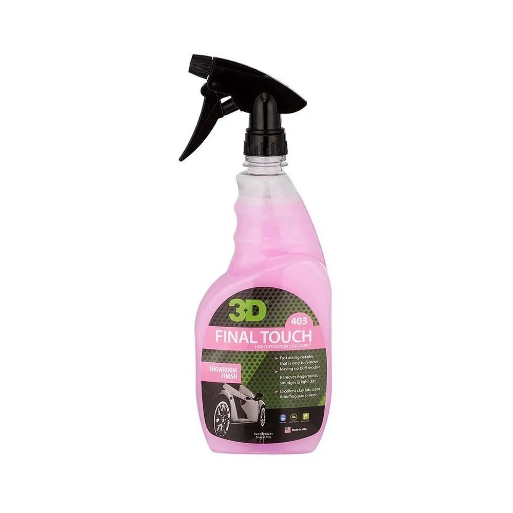 3D FINAL TOUCH es un versátil Quick Detailer desarrollado para dejar una terminación «de salón» en todo tipo de vehículos. Su fórmula esta especialmente diseñada para remover marcas de dedos y residuos de cera, proporcionando brillo y suavidad a las superficies. 3D FINAL TOUCH contiene polímeros lubricantes que realzan el brillo de su vehículo mientras protegen las capas de cera ya existentes. Es ideal para todo tipo de superficies pintadas, cromo y cristales. Puede utilizarse también como lubricante de CLAY BAR.