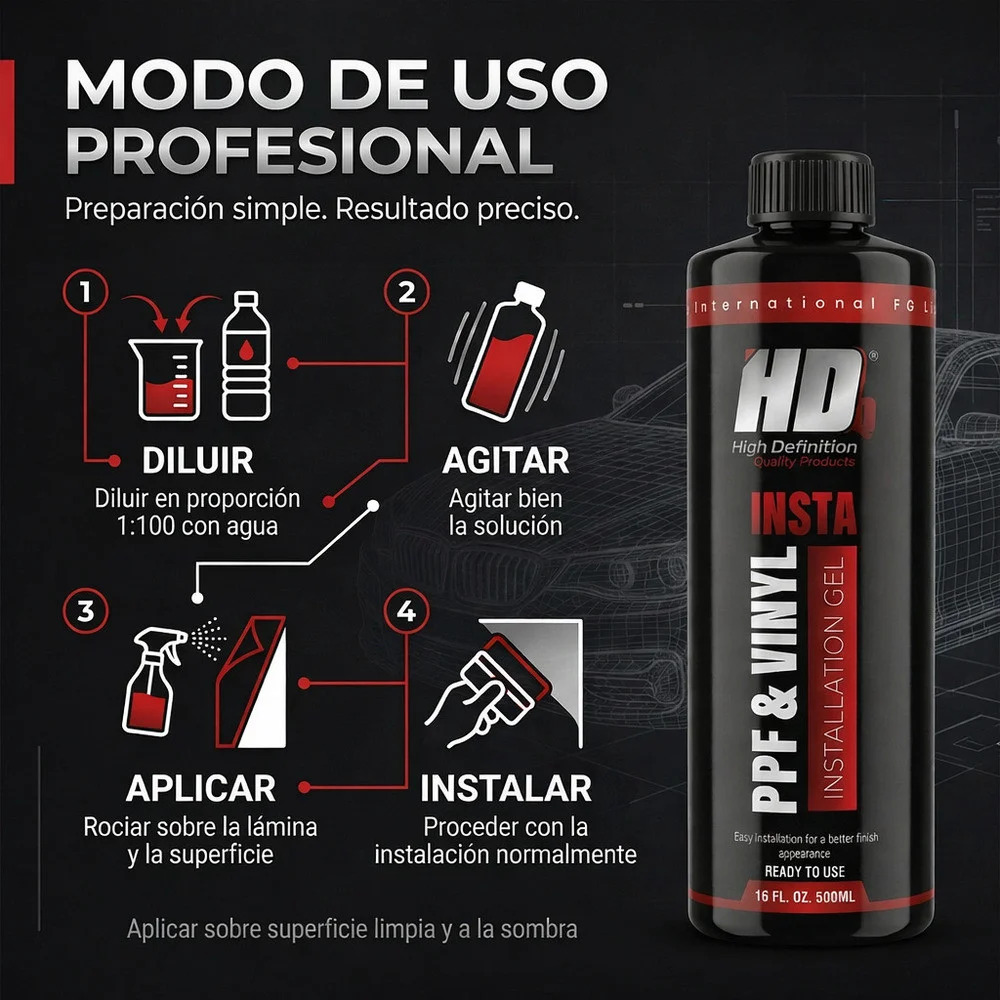 -Diluya el gel de instalación PPF & VINYL en una proporción de 1:100 con agua en una botella rociadora. Para instalar láminas solares para ventanas, diluya en una proporción mayor a 1:100.