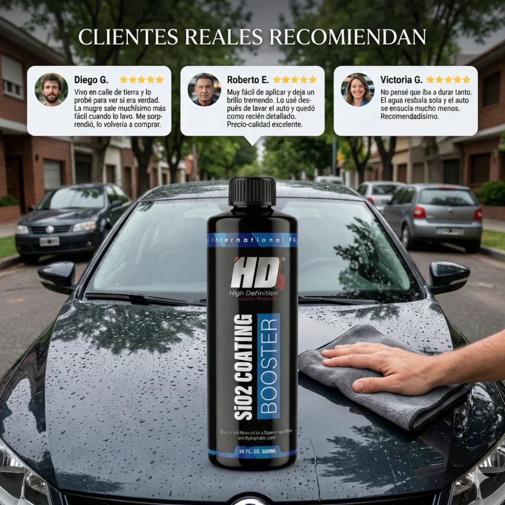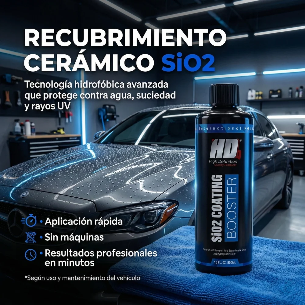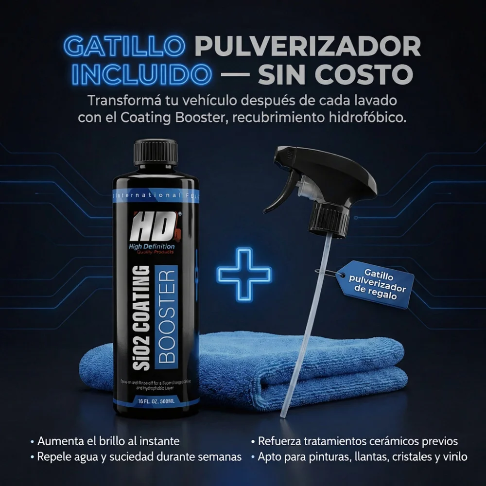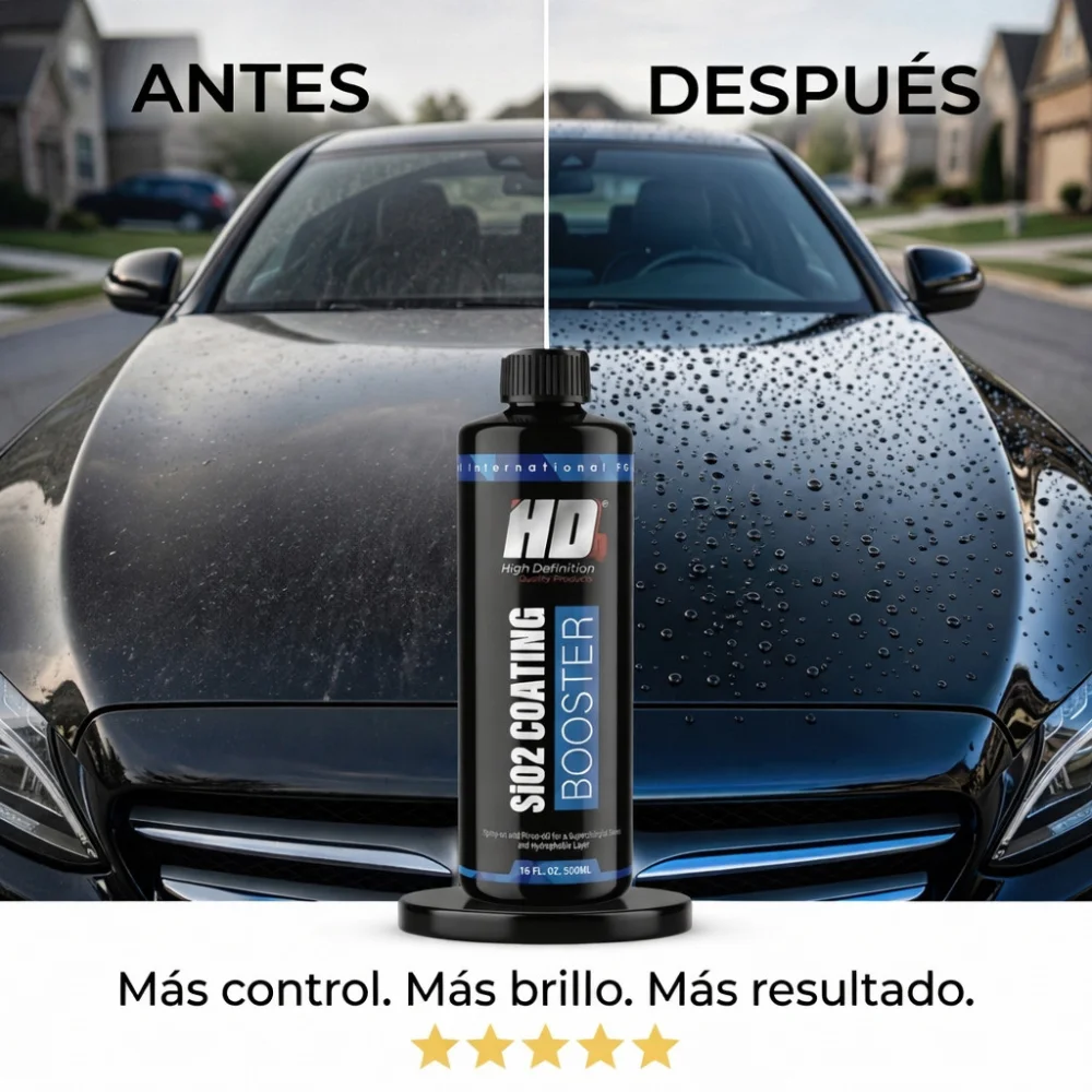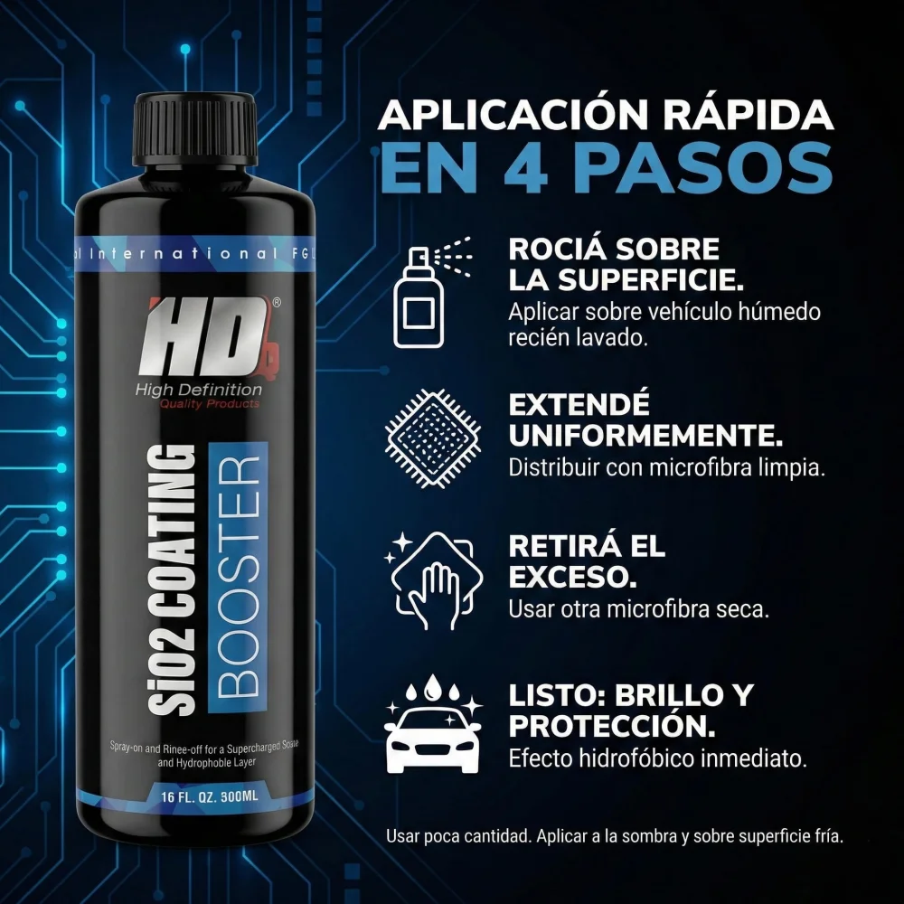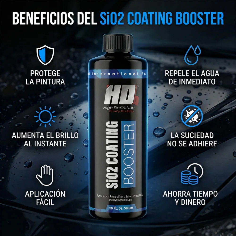 SiO2 Coating Booster es un recubrimiento hidrofóbico en spray que se aplica fácilmente después de lavar el coche. Esta fórmula revolucionaria se aplica en solo minutos y deja la pintura brillante, repeliendo la suciedad y el agua durante semanas gracias a su efecto hidrofóbico. Perfecto para aumentar el brillo y la durabilidad de los vehículos previamente tratados con un recubrimiento de SiO2. Su efecto autolimpiador reducirá la cantidad de lavados rutinarios. Apto para pintura, llantas, cristales, vinilo y película protectora de pintura.